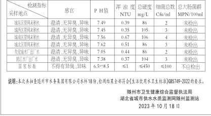 湖北省城市供水水質(zhì)監(jiān)測(cè)網(wǎng)隨州監(jiān)測(cè)站、隨州市衛(wèi)生健康綜合監(jiān)督執(zhí)法局根據(jù)《城市供水水質(zhì)管理規(guī)定》聯(lián)合于2023年10月17日對(duì)隨州市水務(wù)集團(tuán)有限公司先覺廟水廠和封江水廠出廠水和16個(gè)管網(wǎng)末稍水水質(zhì)進(jìn)行了抽樣監(jiān)測(cè),現(xiàn)將抽查檢測(cè)結(jié)果公告如下: