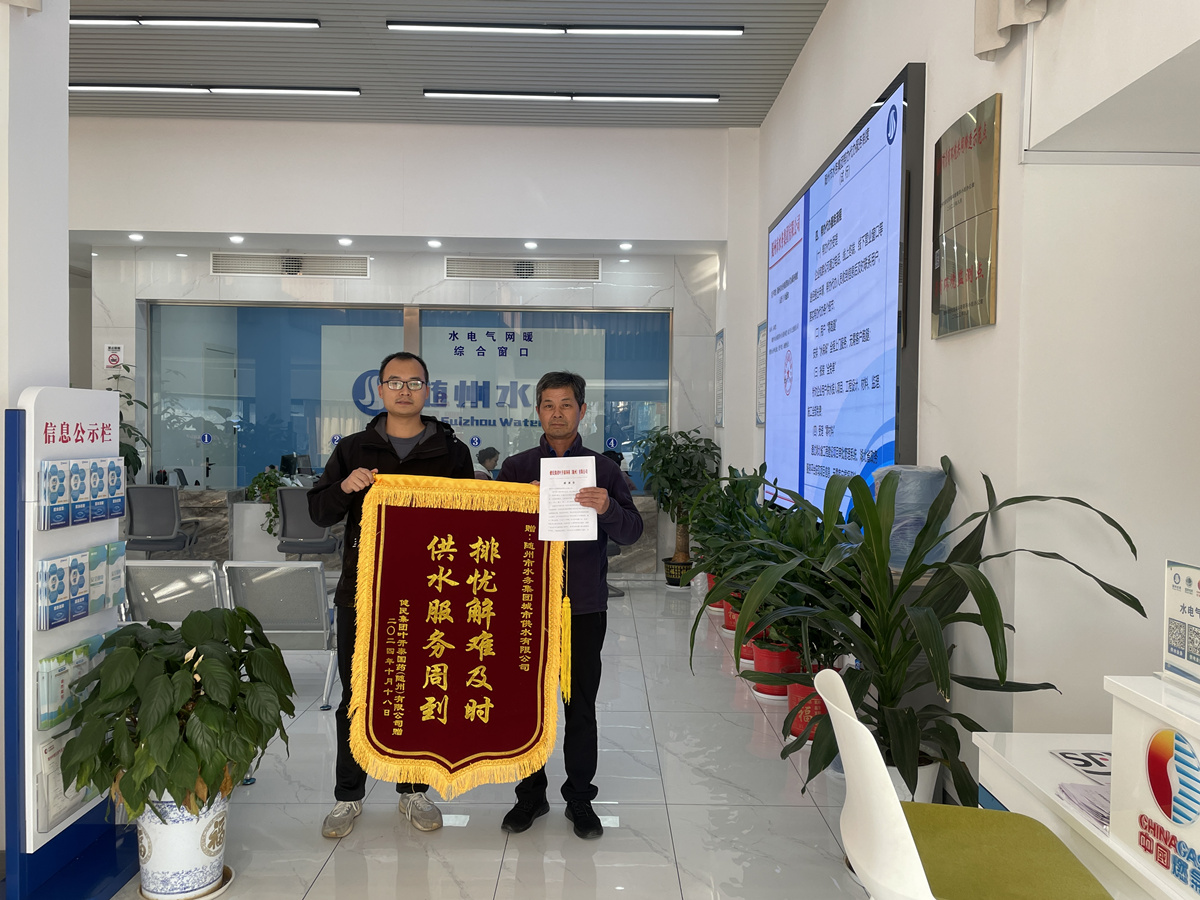 錦旗和感謝信不僅承載的是企業(yè)用戶的感激,更是對隨州水務為企業(yè)辦實事、辦好事的信任和鼓勵。群眾利益無小事!隨州水務將持續(xù)增強主動服務意識,聚焦企業(yè)用水的“難點、堵點、痛點”問題,強化擔當、主動作為,持續(xù)秉持初心,想群眾之所想,急企業(yè)之所急,以更加飽滿的熱情、更加高效的執(zhí)行力、更加貼心優(yōu)質的服務,助力打造一流用水環(huán)境。
